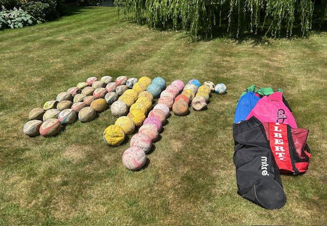 - Sports equipment, including 60 balls (footballs, rugby balls, netballs,) cricket bats, tennis raquets